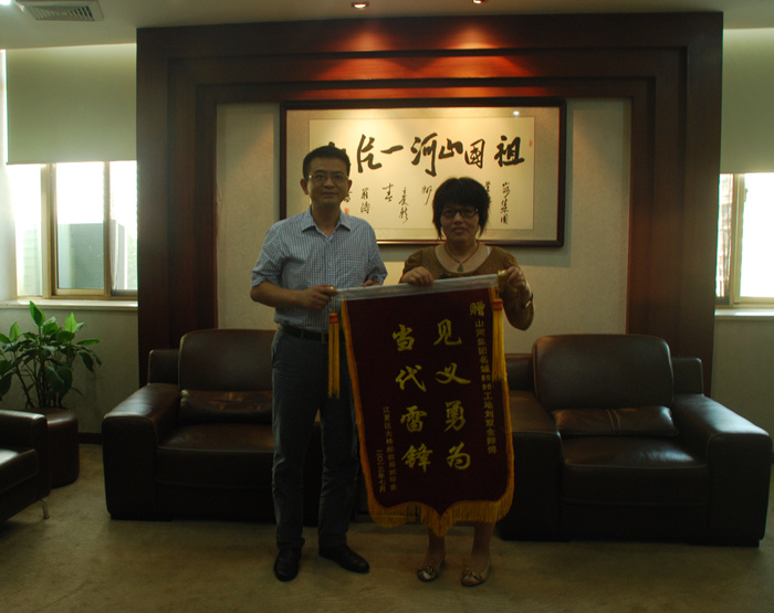 圖為集團公司副總經(jīng)理兼湖北公司總經(jīng)理林中茂(左)接受郭琴香(右)贈送的錦旗