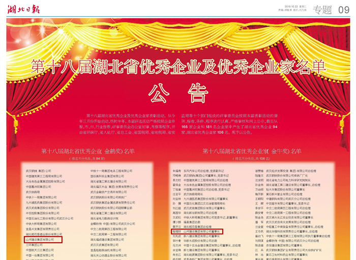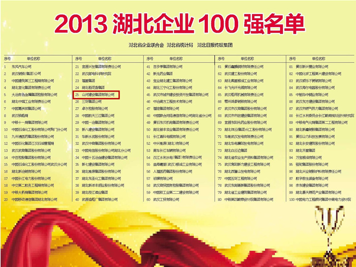 10月22日,2013湖北企業(yè)百?gòu)?qiáng)發(fā)布會(huì)、第十八屆湖北省優(yōu)秀企業(yè)、優(yōu)秀企業(yè)家表彰大會(huì)暨八屆二次會(huì)員代表大會(huì)隆重舉行。湖北省企業(yè)聯(lián)合會(huì)、湖北省統(tǒng)計(jì)局和湖北日?qǐng)?bào)傳媒集團(tuán)聯(lián)合發(fā)布了2013湖北企業(yè)100強(qiáng)名單,山河集團(tuán)位列湖北百?gòu)?qiáng)企業(yè)第25位并榮獲“第十八屆湖北省優(yōu)秀企業(yè)(金鶴獎(jiǎng))”。山河集團(tuán)董事長(zhǎng)程理財(cái)同時(shí)被湖北省企業(yè)聯(lián)合會(huì)和湖北省企業(yè)家協(xié)會(huì)聯(lián)合授予“第十八屆湖北省優(yōu)秀企業(yè)家(金牛獎(jiǎng))”榮譽(yù)稱(chēng)號(hào)。