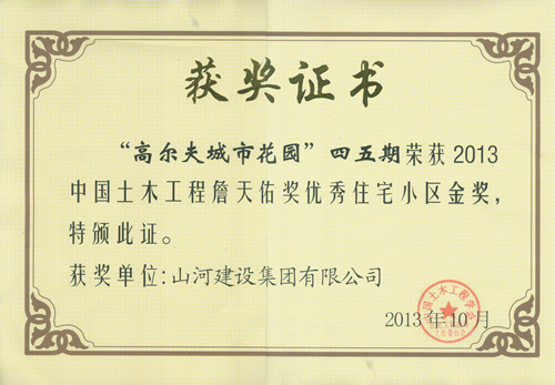 近日,由中國土木工程學會住宅工程指導工作委員會組織的2013年度“中國土木工程詹天佑優(yōu)秀住宅小區(qū)”頒獎儀式在北京舉行,由山河集團承建的 “武漢高爾夫城市花園四、五期”榮獲“中國土木工程詹天佑獎優(yōu)秀住宅小區(qū)金獎”。