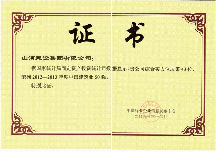 由國家統(tǒng)計局提供最新權(quán)威數(shù)據(jù)支持,中國行業(yè)企業(yè)信息發(fā)布中心主辦的“2013第十二屆中國建筑業(yè)50強(qiáng)測評成果發(fā)布暨頒獎典禮”于2013年12月在京舉行。會上發(fā)布了中國建筑業(yè)50強(qiáng)名單,山河集團(tuán)位居第43名,提前兩年實現(xiàn)了山河集團(tuán) “二五”目標(biāo)中的該項指標(biāo)。