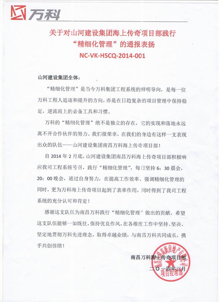 “感謝這支隊(duì)伍為南昌萬科踐行精細(xì)化管理做出的貢獻(xiàn),希望這支隊(duì)伍與南昌萬科共同成長,攜手共創(chuàng)佳績!”近日,山河集團(tuán)海上傳奇項(xiàng)目部收到了一封來自集團(tuán)戰(zhàn)略合作伙伴――萬科地產(chǎn)的表揚(yáng)信。