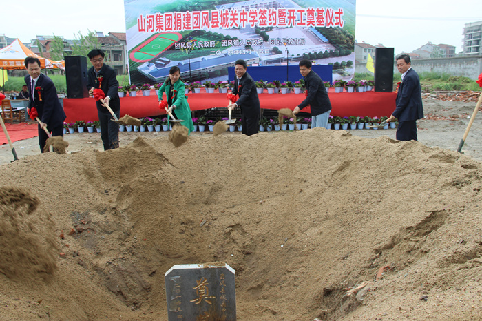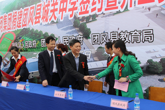 4月15日上午,山河集團(tuán)捐建團(tuán)風(fēng)縣城關(guān)中學(xué)簽約暨奠基開工儀式舉行,團(tuán)風(fēng)縣副縣長黃菊花代表縣人民政府與山河集團(tuán)董事長程理財(cái)簽訂了捐建協(xié)議書。