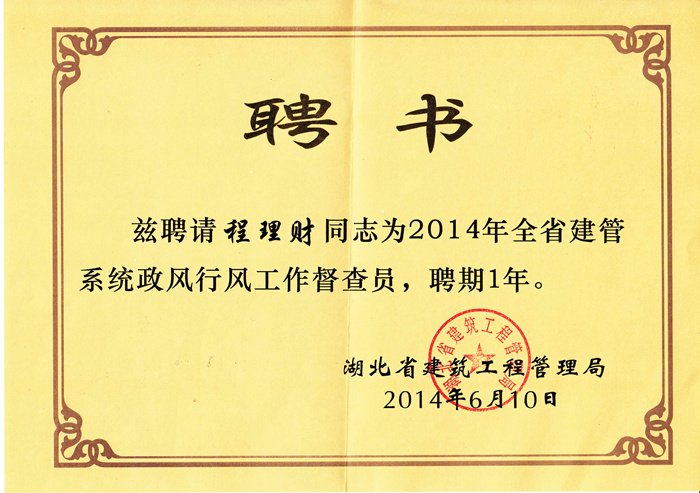 6月10日下午,2014年湖北省建筑工程管理局行風(fēng)評議督查員聘請儀式暨工作座談會在省建管局五樓會議室召開。集團(tuán)公司董事長程理財(cái)同志被聘請為全省建管系統(tǒng)政風(fēng)行風(fēng)工作督查員,湖北省住房和城鄉(xiāng)建設(shè)廳黨組成員、建管局局長、黨組書記張弘向15名督查員頒發(fā)了聘書。