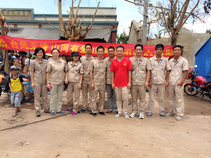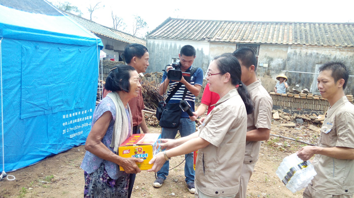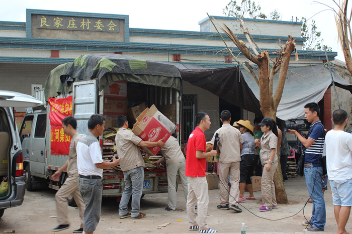 與此同時,海南各地都是眾志成城的救災場面,一方有難,八方支援。山河集團在開展自救的同時,心系災民,當得知重災區(qū)文昌部分村鎮(zhèn),由于交通偏僻,信息不暢,得不到及時救助,災民的生活非常的艱難時,山河人心急如焚。山河集團已進駐海南6年,扎根海南、情系海南。在災難面前,山河人勇于擔當,自發(fā)的組織捐款10萬余元,采購了幾噸急需生活物資,如米、油、水、食品、藥品等。7月26日,在??跓釒Р笥浾叩膸ьI下,公司組織員工來到了一線災區(qū)文昌市錦山鎮(zhèn)良民村。 當我們來到該村時,村民已等待多時,看到我們的到來非常的激動。當時下著大雨,村民們顧不上遮蓋自家的屋頂、收拾東西,都趕來搬運救災物資,雨水、汗水、淚水流淌在臉上,感激之情流淌在心間。在村長的帶領下,我們見到了村里的低保戶年邁的阿婆,她老無所倚,幾年前她兒子去逝了,幾天前兒媳重病也去逝了,現只剩下小孫兒相依為命,臺風又讓這個本來很不幸的家庭受到重創(chuàng),她們失去了僅有的一間住所,現寄住在只有幾個平方的一個臨時的帳篷里,當我們把米、油等物資送到阿婆的手中時,她熱淚盈眶,緊握我們的雙手,不停的道謝,看到老人的悲痛淚水,我們不禁心酸,淚水打濕了眼眶。我們鼓勵她建立對生活的信心,同時也希望社會給予她更多的關愛,讓她的晚年生活無憂。