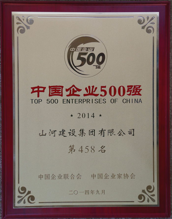 9月2日,“2014中國500強企業(yè)高峰論壇”在重慶舉行,會議當天發(fā)布了2014中國500強企業(yè)榜單。山河集團營業(yè)收入256億元,排名458位,首次進入中國企業(yè)500強。