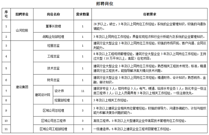 此次招聘,正是基于山河集團(tuán)持續(xù)健康發(fā)展所構(gòu)建的廣闊平臺。山河集團(tuán)堅持“溝通、認(rèn)同、感悟”的團(tuán)隊(duì)觀與“能力有多大,舞臺就有多大”的人才觀,以不拘一格的用人機(jī)制、良好的職業(yè)發(fā)展通道、極具行業(yè)競爭力的薪酬激勵體系誠邀社會各界英才加盟山河,共筑品質(zhì)山河,成就百年基業(yè)。