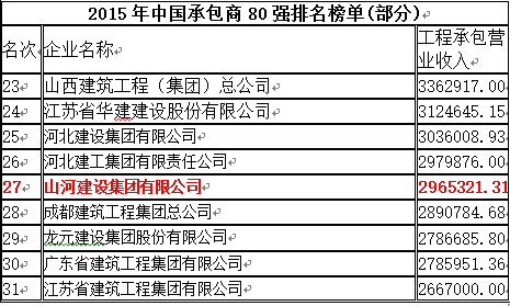 11月19日,2015ENR/建筑時報“中國承包商80強(qiáng)和工程設(shè)計企業(yè)60強(qiáng)”頒獎盛典在南京舉行。山河集團(tuán)再次上榜承包商80強(qiáng),排名第27位。