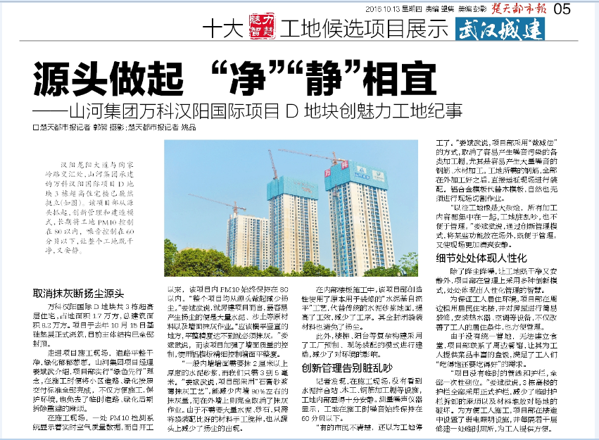 漢陽龍陽大道與陶家?guī)X路交匯處,山河集團(tuán)承建的萬科漢陽國(guó)際項(xiàng)目D地塊3棟超高住宅樓已巍然挺立。該項(xiàng)目部從源頭抓起,創(chuàng)新管理和建造模式,長(zhǎng)期將工地PM10控制在80以內(nèi),噪音控制在60分貝以下,讓整個(gè)工地既干凈,又安靜。