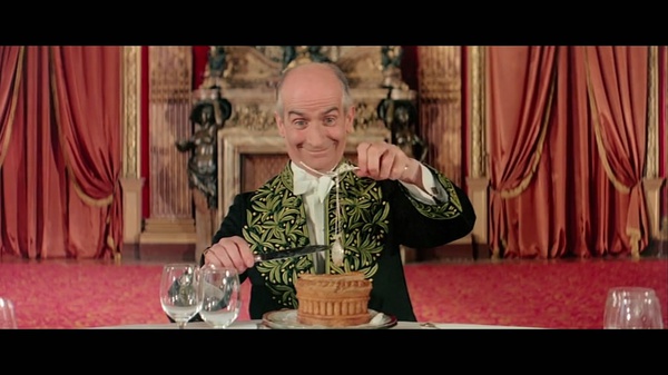 回到電影本身,每天都能到各種地方胡吃海喝的主編,被菲奈斯這個(gè)小老頭演繹的生靈活現(xiàn),即便對(duì)快餐嗤之以鼻,但是幽默的法國(guó)人也是以一種獨(dú)有的黑色幽默方式講述了那個(gè)年代快餐文化對(duì)傳統(tǒng)美食文化的沖擊與看法。影片最后的點(diǎn)睛之筆令人深思:清晨,小老頭與往常一樣,端坐在餐桌前,心情愉悅的切開(kāi)剛剛烘焙好的新鮮糕點(diǎn),里面卻突然出現(xiàn)了一支懷表,影片至此戛然而止,或許是預(yù)示著快餐時(shí)代會(huì)隨著時(shí)間的浪潮到來(lái),無(wú)法阻擋吧。