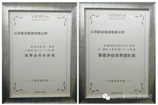 山河集團(tuán)喜獲萬科上海區(qū)域年度“優(yōu)秀合作伙伴獎(jiǎng)”和“季度評(píng)估優(yōu)秀團(tuán)隊(duì)獎(jiǎng)”兩項(xiàng)殊榮,這也是南昌萬科總承包單位近年來首次獲此殊榮。