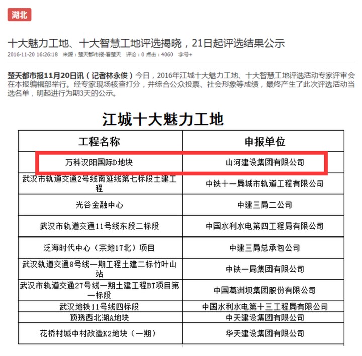 11月20日,“江城十大魅力工地”評選揭曉,經(jīng)專家現(xiàn)場核查打分,并綜合公眾、社會形象等成績,山河集團(tuán)湖北公司承建的萬科漢陽國際項(xiàng)目榮獲“江城十大魅力工地”榮譽(yù)稱號。