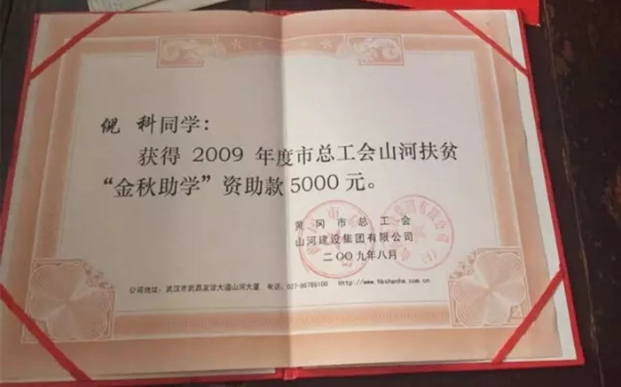 2009年,倪科獲得山河集團(tuán)5000元資助