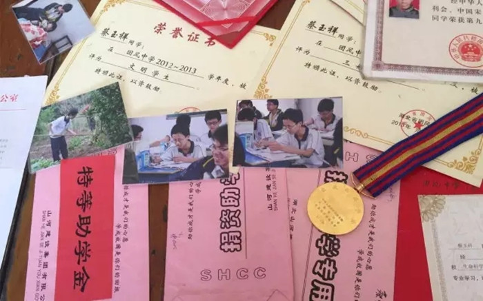受助學(xué)生蔡玉祥獲得的各種獎(jiǎng)狀及獎(jiǎng)牌