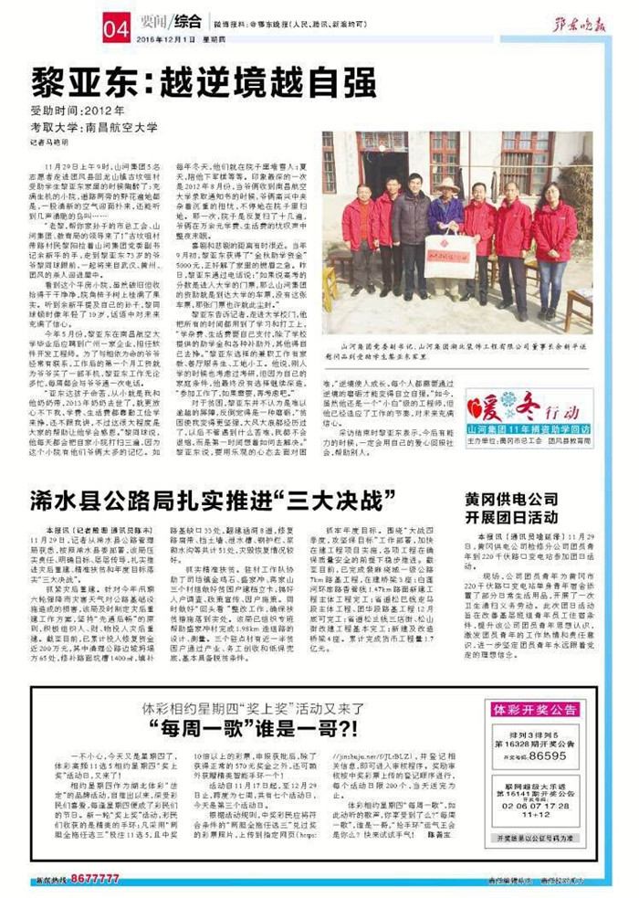 喜劇和悲劇的距離有時很近。當(dāng)年9月初,黎亞東獲得了“金秋助學(xué)資金”5000元,正好解了家里的燃眉之急。昨日,黎亞東通過電話說:“如果說高考的分?jǐn)?shù)是進(jìn)入大學(xué)的門票,那么山河集團(tuán)的資助就是到達(dá)大學(xué)的車票,沒有這張車票,那張門票也許就此塵封?!?/span>