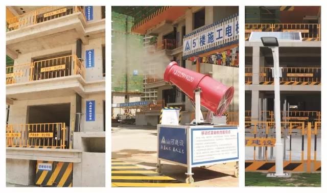 標準化的綠色施工。為減少揚塵污染,項目部進行大面積綠化,同時還對施工道路、車輛定期進行沖洗處理,建立了樓層垃圾清運管道系統(tǒng)、外架噴淋系統(tǒng),使用防塵霧炮抑塵,施工用水進行循環(huán)利用等。
