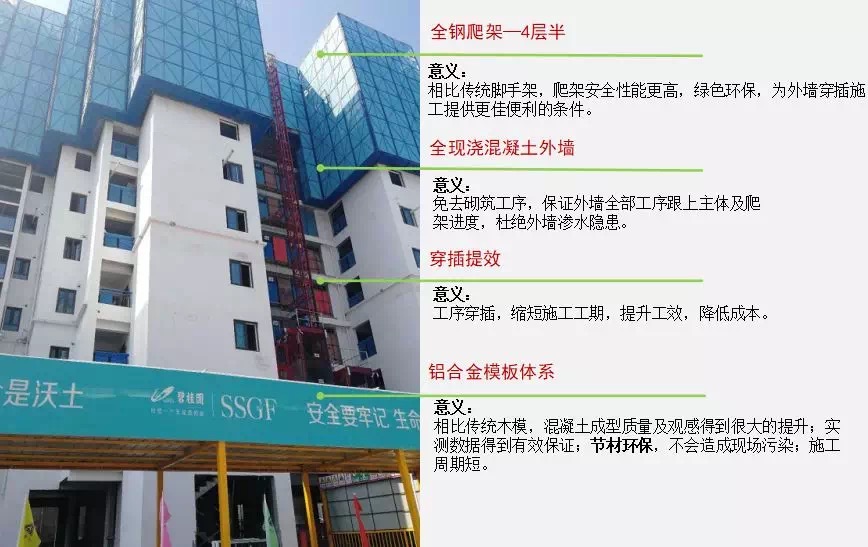 該項目采用了鋁合金模板、全現(xiàn)澆混凝土外墻、全鋼智能爬架、高精度砌塊+薄抹灰、樓層截水系統(tǒng)以及全穿插施工等十多項新型建筑工藝,從做法上避免了開裂、滲漏隱患,有力的加快了現(xiàn)場的施工進(jìn)度。
