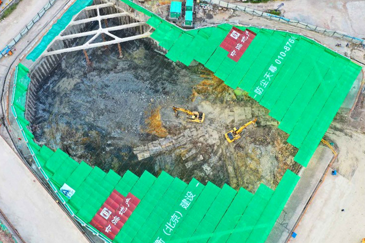 “天幕”采用阻燃材料,減少了消防安全隱患,同時通過科學(xué)的標(biāo)高設(shè)計,既不耽誤施工作業(yè),又可回收循環(huán)使用,規(guī)避了常規(guī)防塵網(wǎng)污染土壤、頻繁更換、影響施工、耗費(fèi)人力物力等弊端,為綠色施工、智慧建造提供了新的路徑。