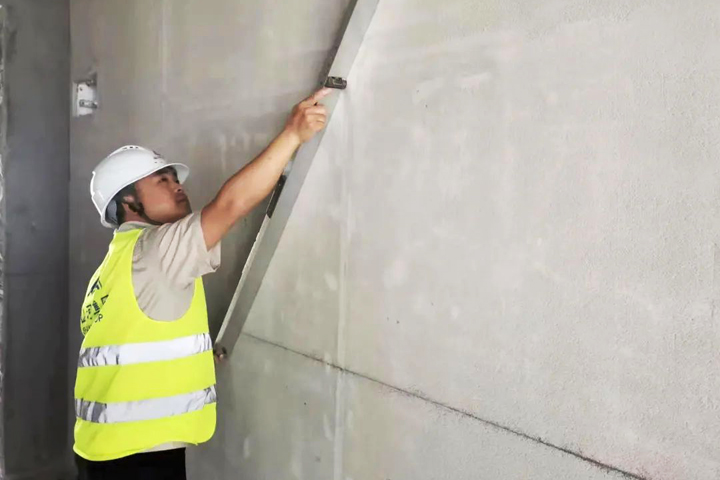 ▲新余聯(lián)發(fā)永康狀元府項目實測員在檢查墻面平整度
