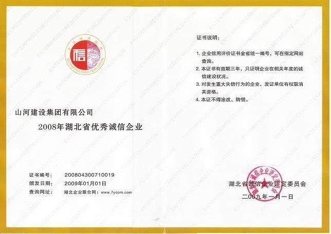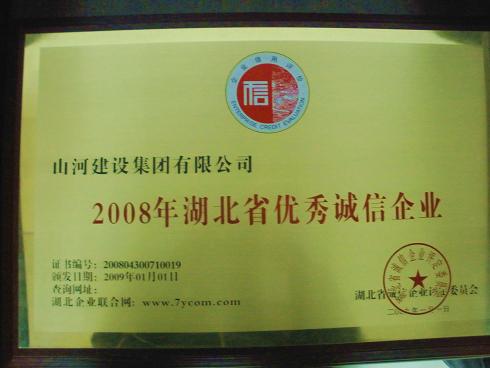 山河集團(tuán)榮膺2008湖北省優(yōu)秀誠信企業(yè)榮譽(yù)