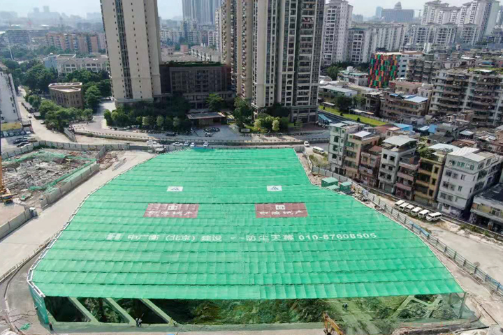 石崗路項目位于廣州市海珠區(qū)石溪村得寶球場旁,鄰近地鐵10號線石溪站,總建筑面積約6.5萬平方米,包括3棟36層、建筑高度116.2米的高層住宅。工程周邊環(huán)境復(fù)雜、裸土面積大、施工工序多,大跨度防塵天幕系統(tǒng)的啟用,開創(chuàng)了廣州基坑工程“全封閉”施工的先河。