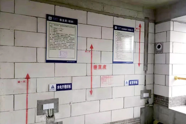 施工過程中,地下室后澆帶采用PVC管砼構(gòu)造柱獨(dú)立支撐體系,高層住宅施工采用鋁模板體系、附著式升降腳手架,現(xiàn)場(chǎng)設(shè)置工法樣板及樓層實(shí)體樣板指導(dǎo)施工,應(yīng)用了高精度砌塊施工、石膏砂漿薄抹灰、外墻XPS板內(nèi)保溫等技術(shù)工藝,采用拉片式鋁模體系,全砼外墻,門窗企口、滴水線等一次成型,保證施工質(zhì)量一次成優(yōu)。